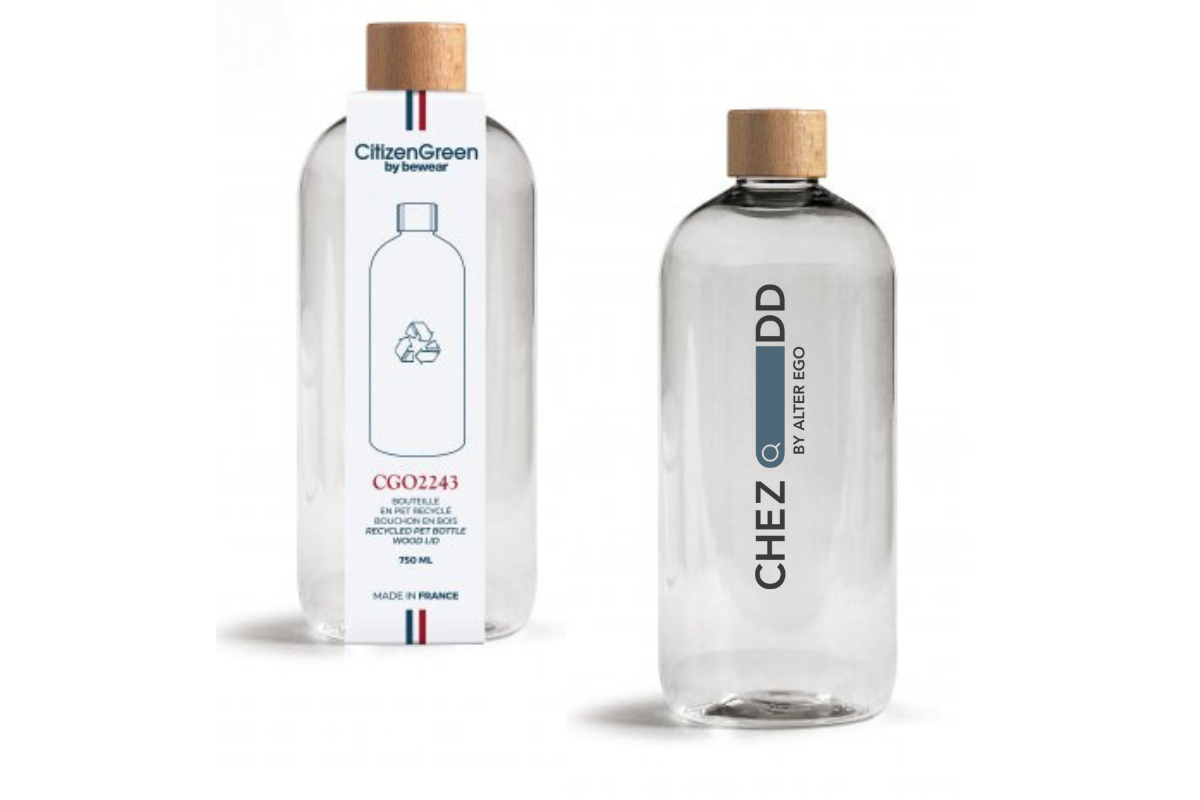 Gourde promotionnelle de 750ml avec bouchon à vis. Matière 100% PET recyclé, hêtre, aluminium.