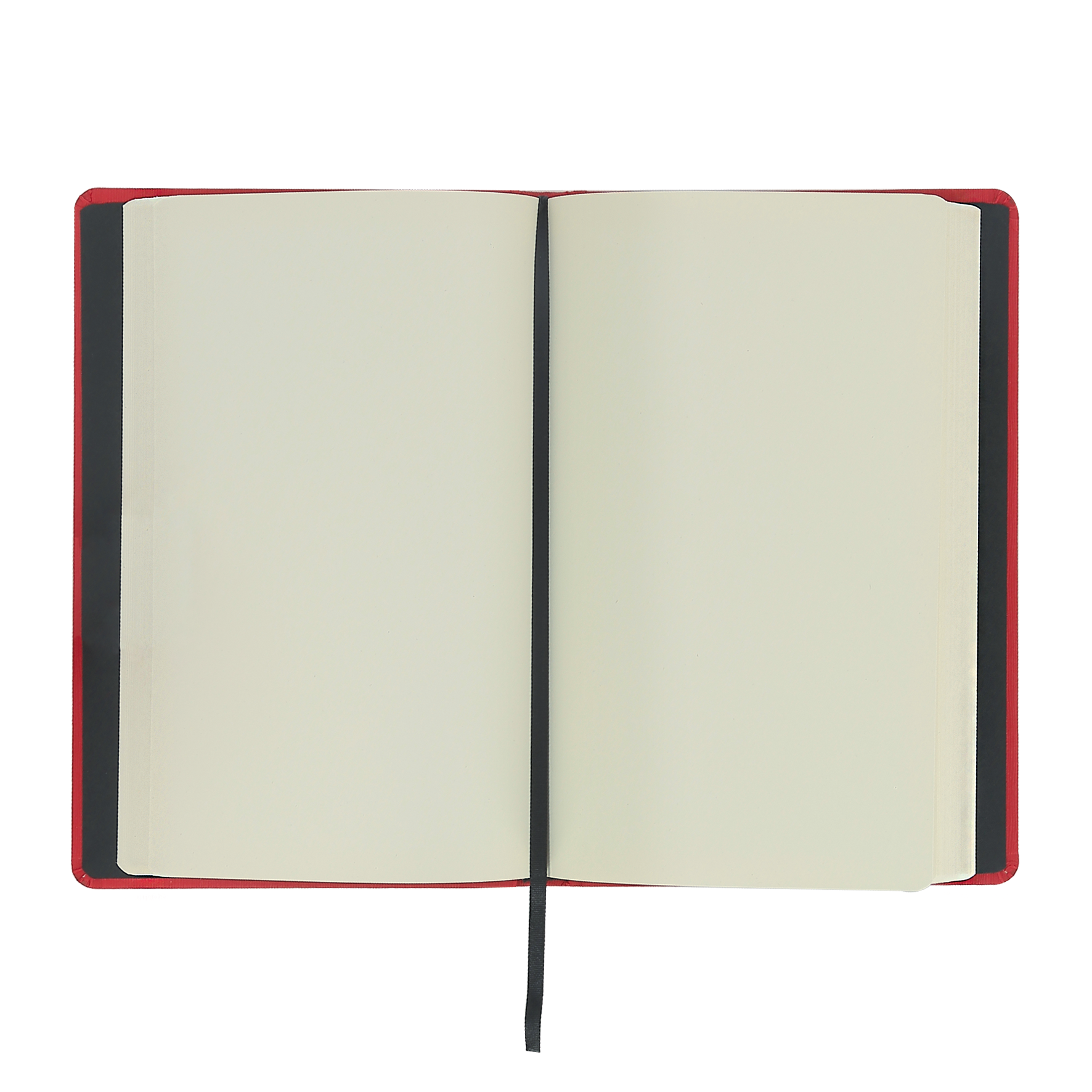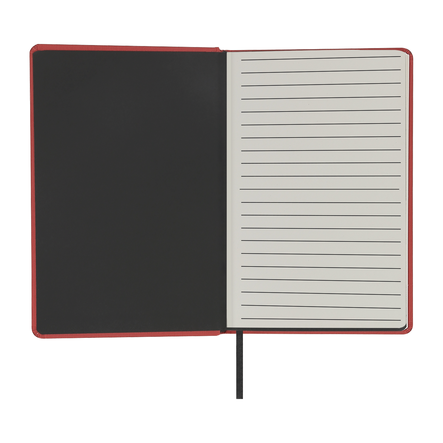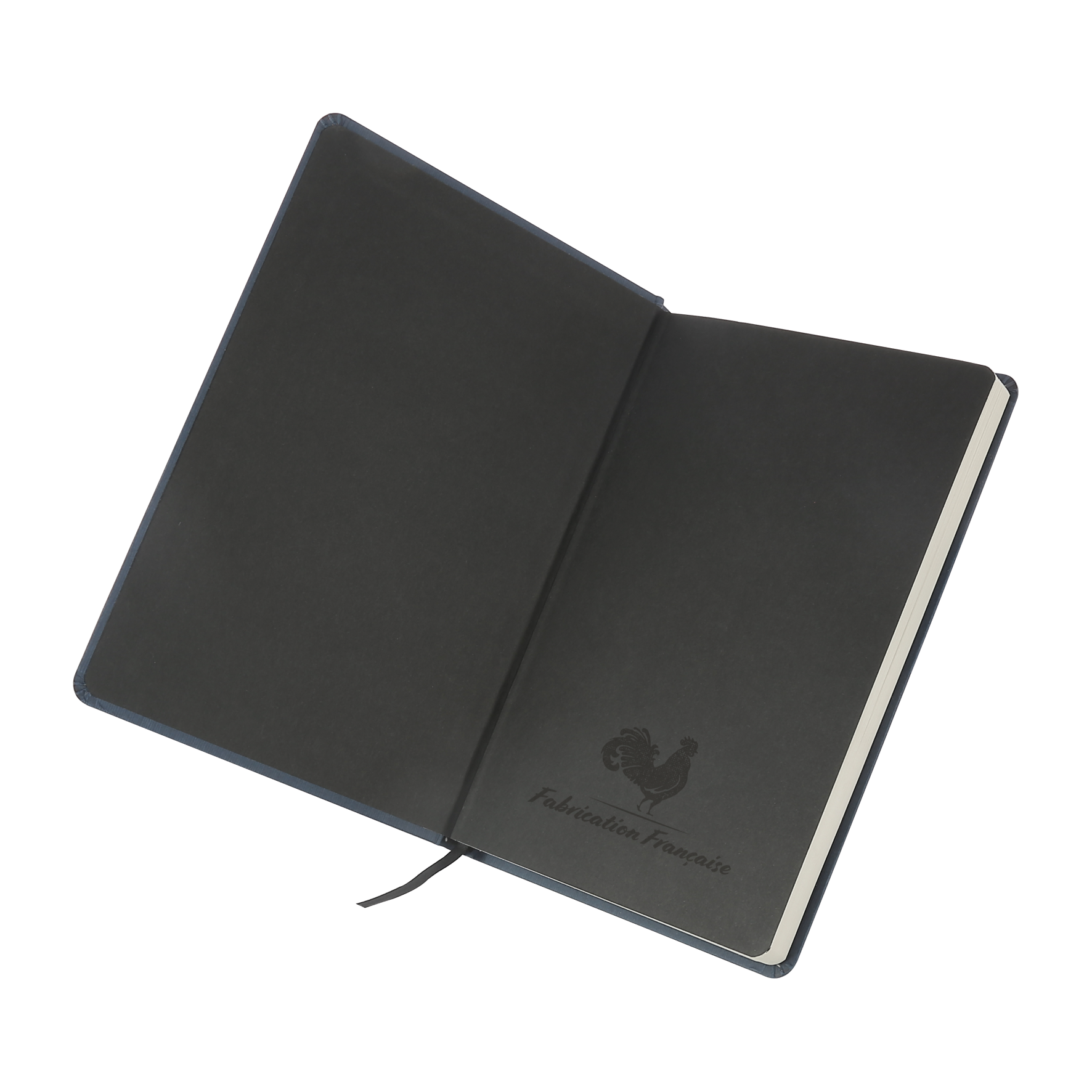 Dimensions : 14 x 21 cm | Poids 280 gr. | Plusieurs coloris au choix | Couverture carton rigide 300gr./m² | Feuilles 80gr./m² | 160 pges crème 80 gr non lignées | Dos collé | Marque-page ruban noir | Pages de gardes noires | Guide d’écriture quadrillé et ligné détachable | Quantité minimum de commande : 50 exemplaires