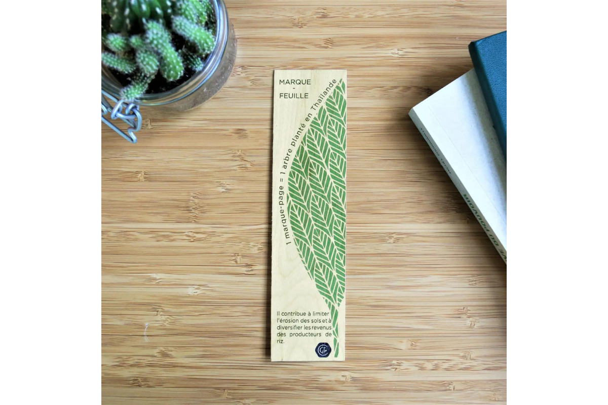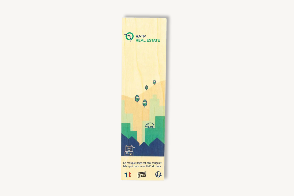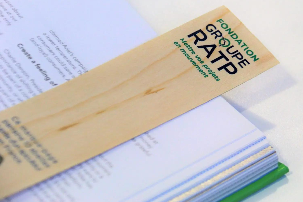 Notre Marque page publicitaire en bois fabriqué dans le Jura en France au sein d’un Etablissement et Service d’Aide par le Travail (ESAT), et conçu en bois, notre marque page personnalisable offre un toucher agréable et un aspect élégant qui renforcent le lien intime que les lecteurs ont avec leurs livres. Ce marque page publicitaire est un goodies durable car il est conçu à partir de matériaux de qualité. Nous nous assurons ainsi que chaque marque-page est durable et résistant.