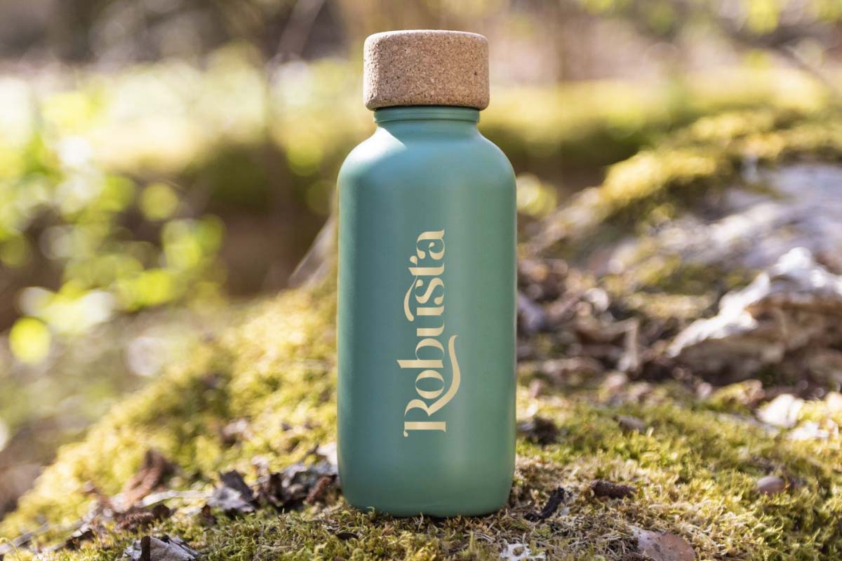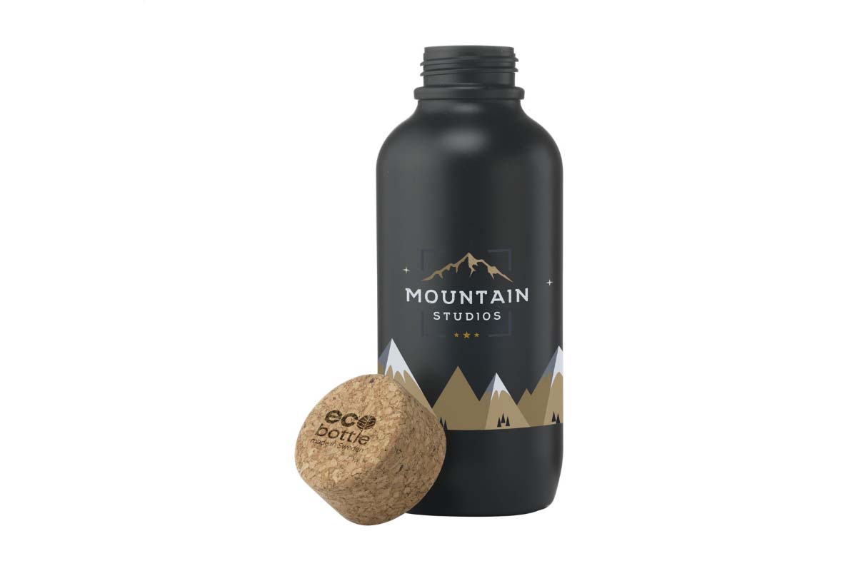 Notre nouvelle gourde publicitaire personnalisable, fabriquée à partir de matériaux 100% végétaux : composée à 98% de canne à sucre et bouchon en liège naturel, en Suède.