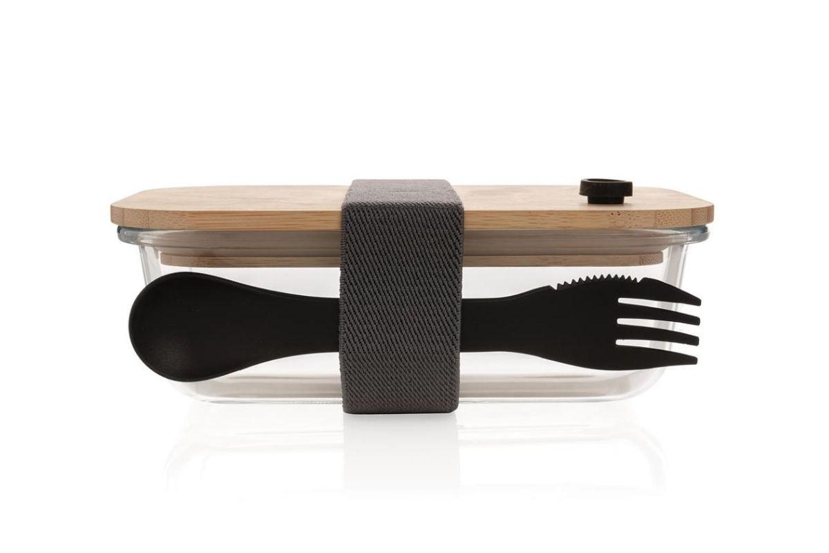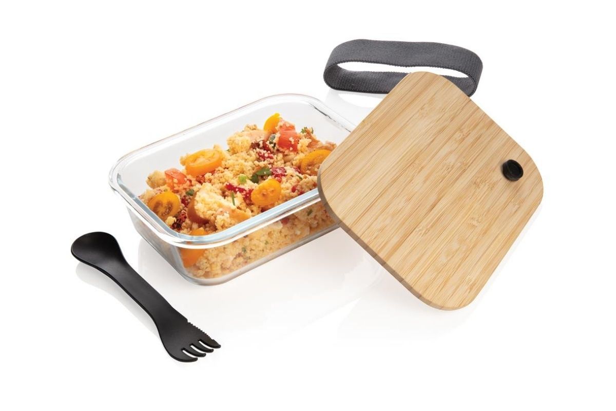 Emportez vos repas avec vous grâce à cette boîte à repas (en verre borosilicate) avec couvercle hermétique en bambou. Sa qualité vous assure de conserver la fraîcheur de vos aliments. Fourchette/cuillère incluse. Fabriquée avec des matériaux de haute qualité, notre lunch box personnalisables allie durabilité et praticité. Elle est conçue pour garder vos aliments frais et bien protégés, grâce à son compartiment hermétique et son couvercle solide. De plus, elle est facile à nettoyer et résiste aux chocs, garantissant ainsi une utilisation durable. Que vous souhaitiez offrir un cadeau promotionnel à vos clients ou équiper vos employés avec une lunch box personnalisée, notre produit répondra à toutes vos attentes. Ne manquez pas l'occasion de promouvoir votre entreprise et ses engagements tout en facilitant la vie de vos clients et collaborateurs. Faites de vos repas une expérience personnalisée et mémorable !