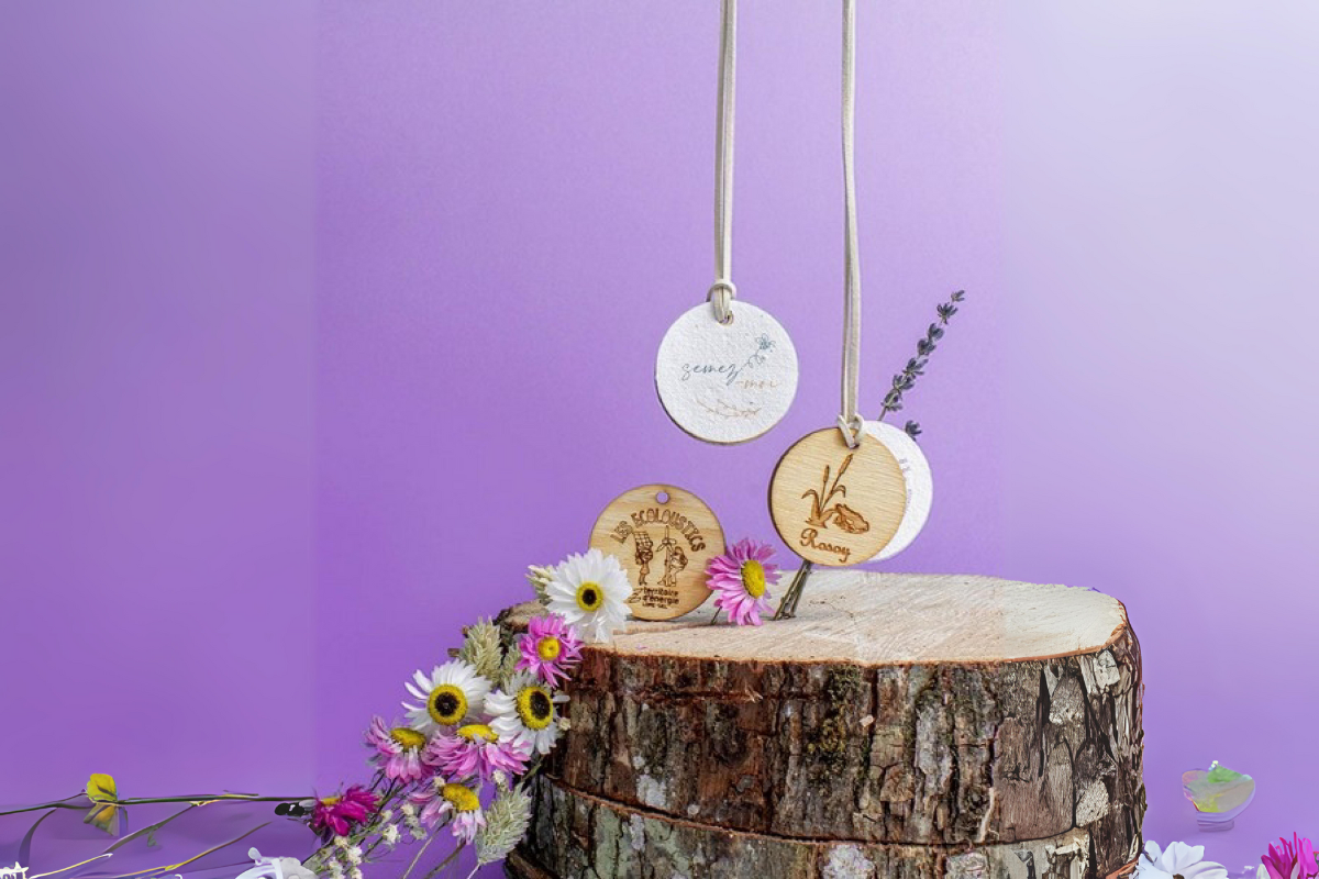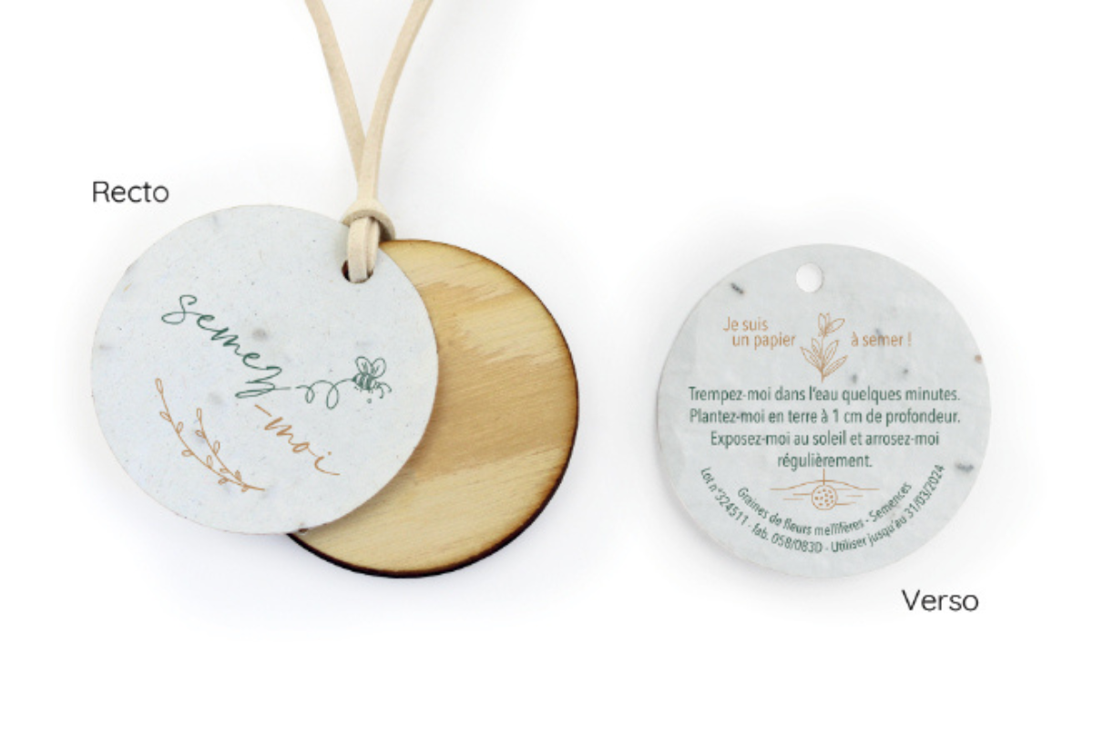 Découvrez notre médaille à planter en bois avec papier à graines de fleurs mellifères, personnalisable en marquage au laser !