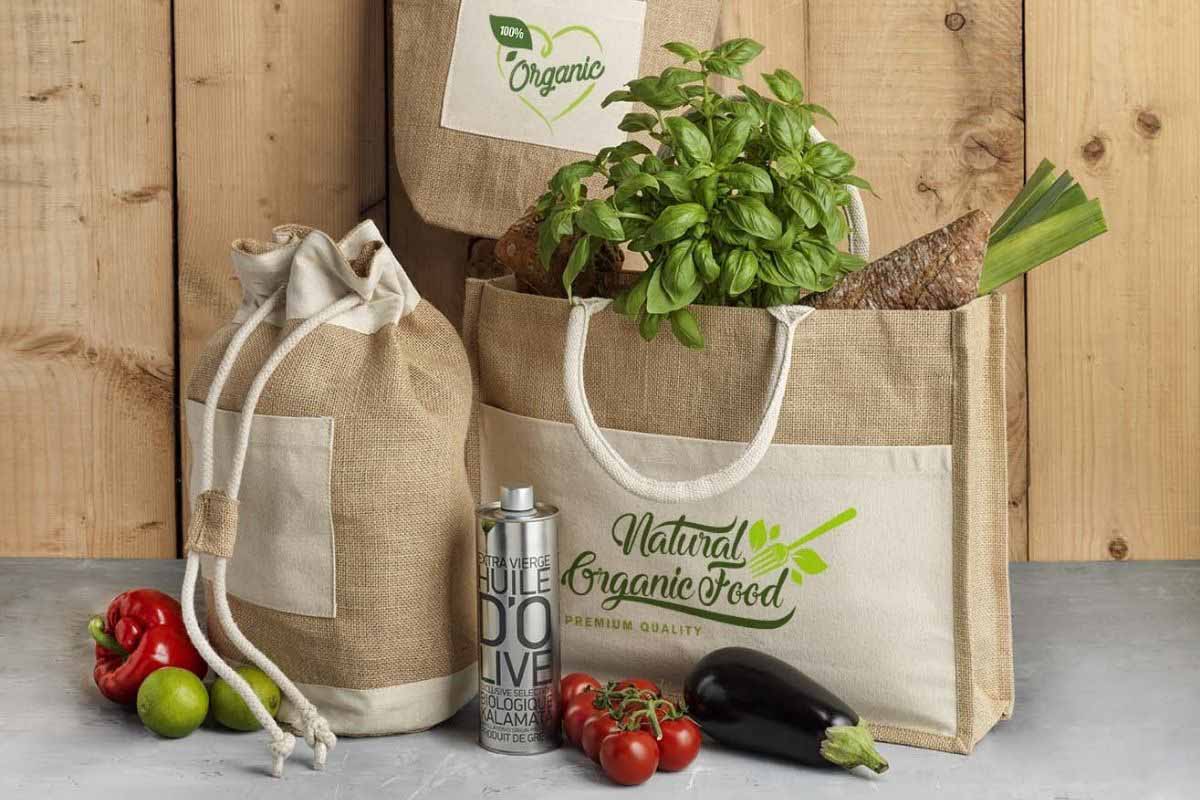 Découvrez ce sac promotionnel écologique en toile de jute et canvas. La densité du tissu de 320 g/m² rend le sac publicitaire très solide et adapté au transport d’objets lourds dans son compartiment principal.