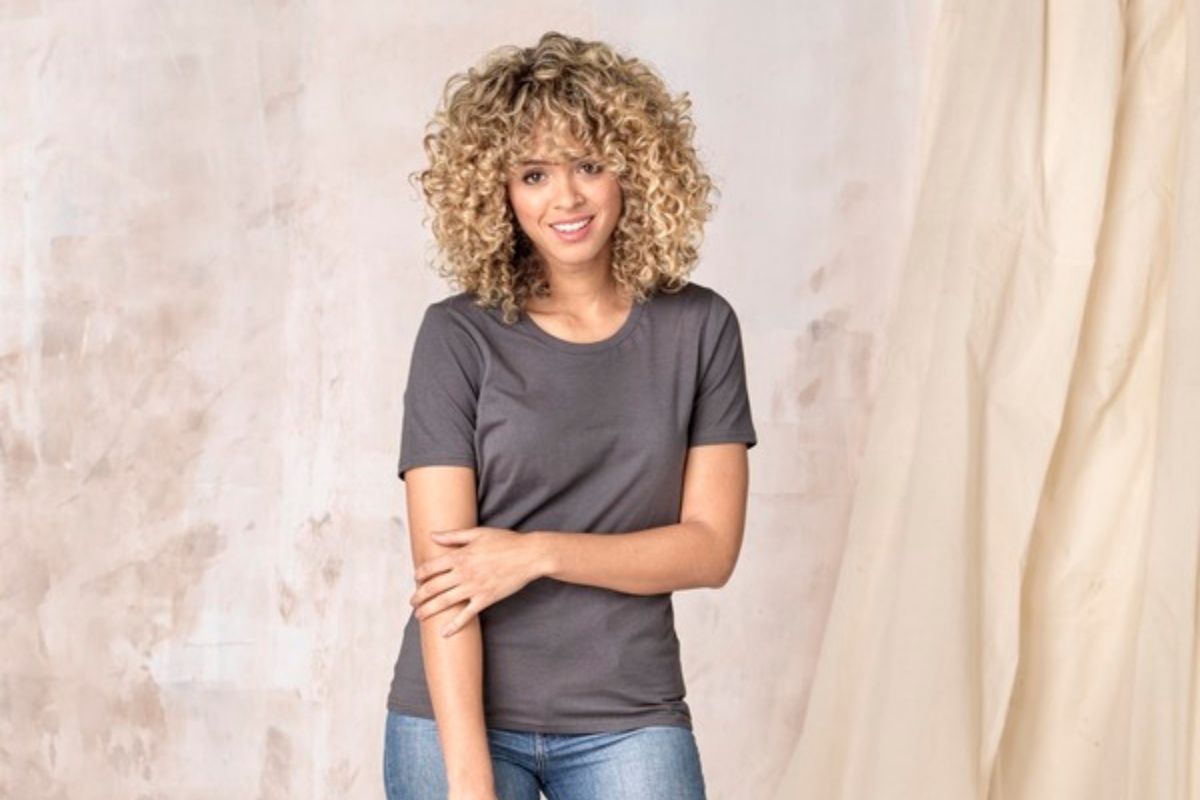 Avec les qualités du textile retail mais certifié GOTS, 160 g/m2. Maille jersey simple, couture latérales, bande bicolore d’épaule à épaule, col en tricot plat.