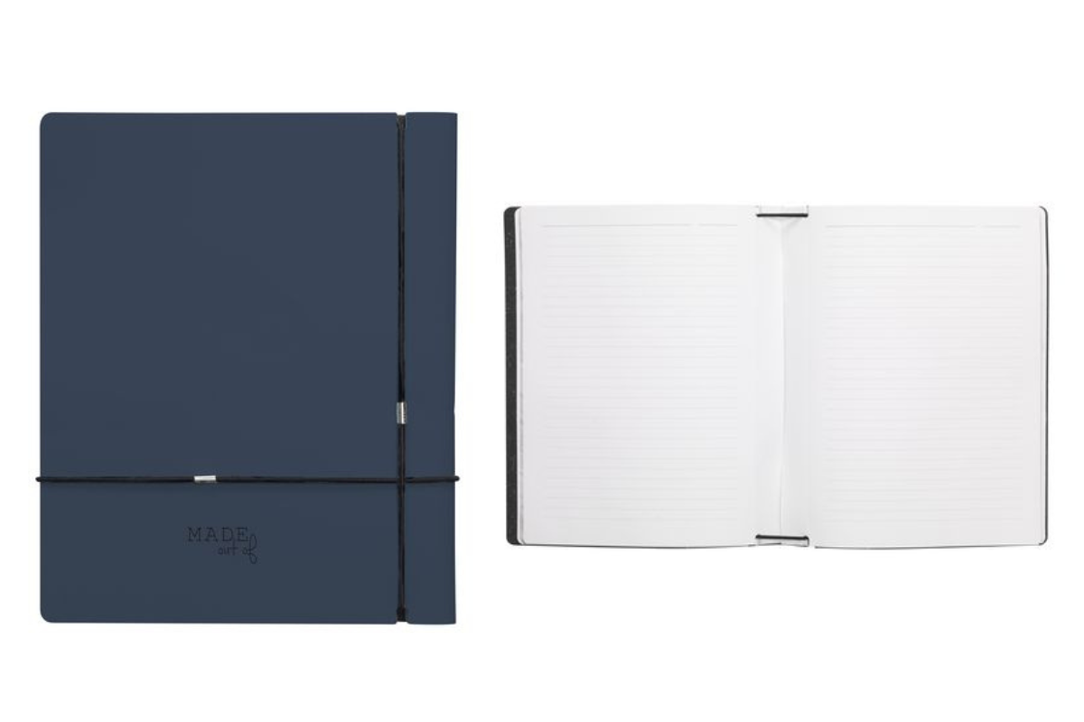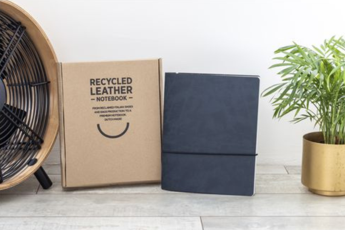 Avec une couverture réalisée à partir de déchets de cuir recyclés (provenant de cuir italien) et de liants naturels. Le cuir recyclé est très solide, a un bel aspect mat et sent le cuir. La couche supérieure colorée est constituée d’un revêtement PU très fin, de 100% à base d’eau. Ce carnet publicitaire à fermeture élastique peut être reclassé (Réutiliser & Réduire).