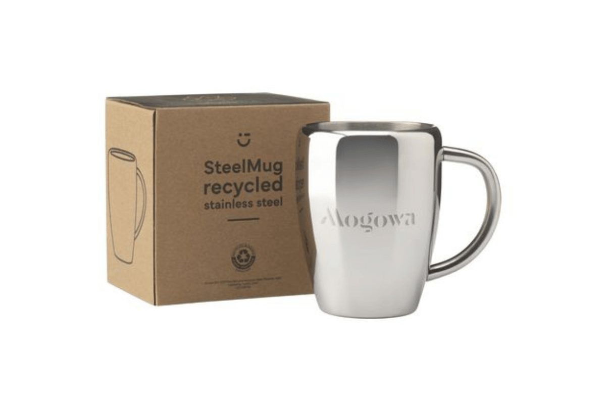 Mug Publicitaire à double paroi en acier inoxydable recyclé | Certifié RCS | Matière recyclée totale : 80% | Capacité 220 ml | Chaque article est fourni dans une boite individuelle en papier kraft marron | Quantité minimum de commande : 50 exemplaires
