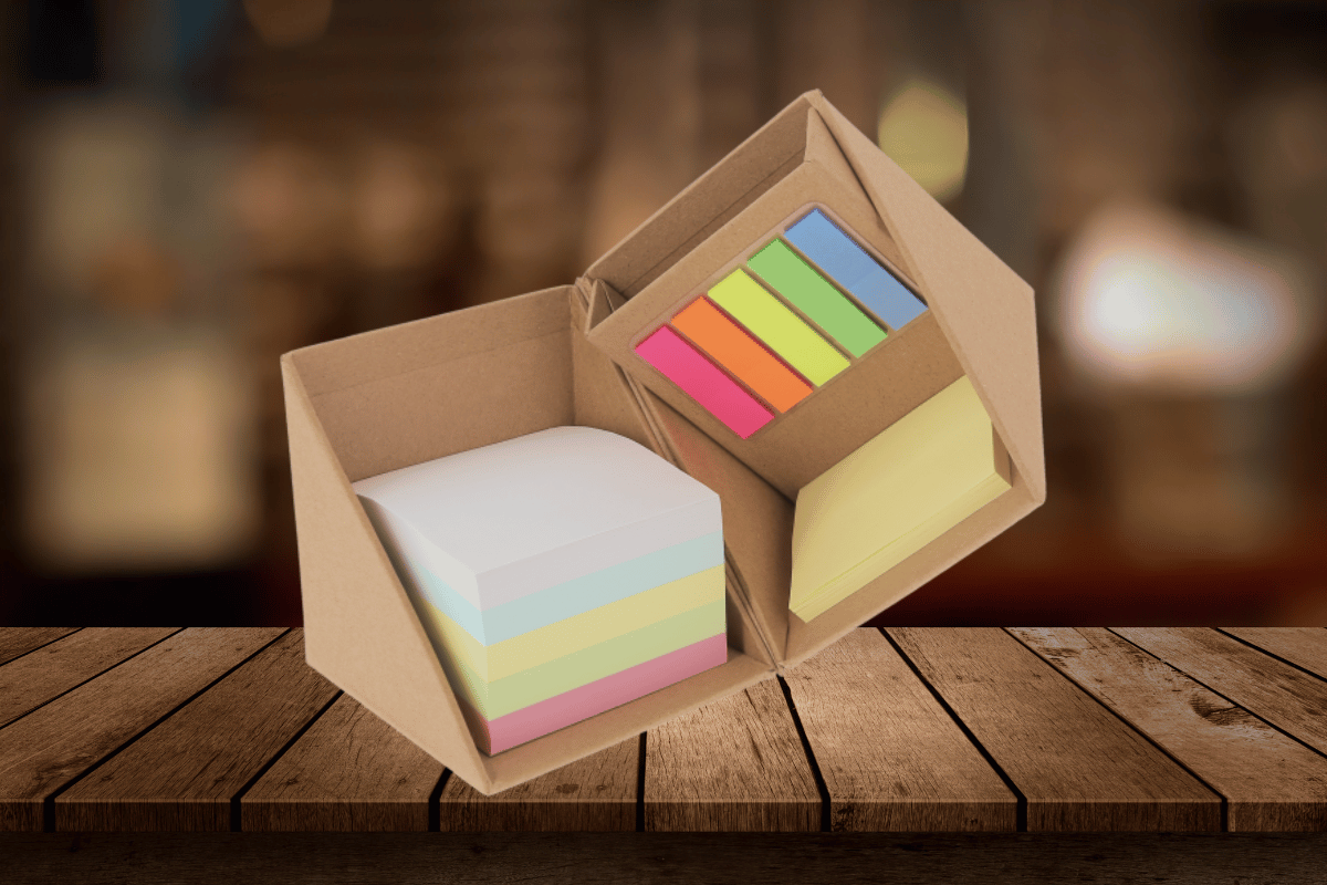Bloc cube fonction pot à crayon publicitaire avec 500 feuilles colorées (100/couleur), 50 feuilles adhésives jaunes et 125 marque-pages adhésifs (25/couleur). Pot à crayon publicitaire, en carton 100% recyclé kraft.